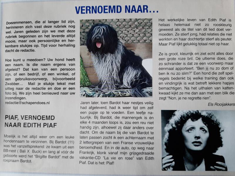 Nouvelle Piaf van Deerne Dartel is op 19-06-2018 geboren in een nest van 9 puppen. Ze heeft 5 broers en 3 zussen. Sinds 11-08-2018 woont ze bij ons. In het nest heette ze Streepje vanwege het dwarse streepje halverwege haar rug. Piaf is de dochter van Hopla Hebe van Deerne Dartel en Polo van 't Doezehoes. Natuurlijk heeft ze haar zeedoop al gehad, zit ze op puppycursus en wordt ze ook door Bardot en Co(osje) opgevoed.