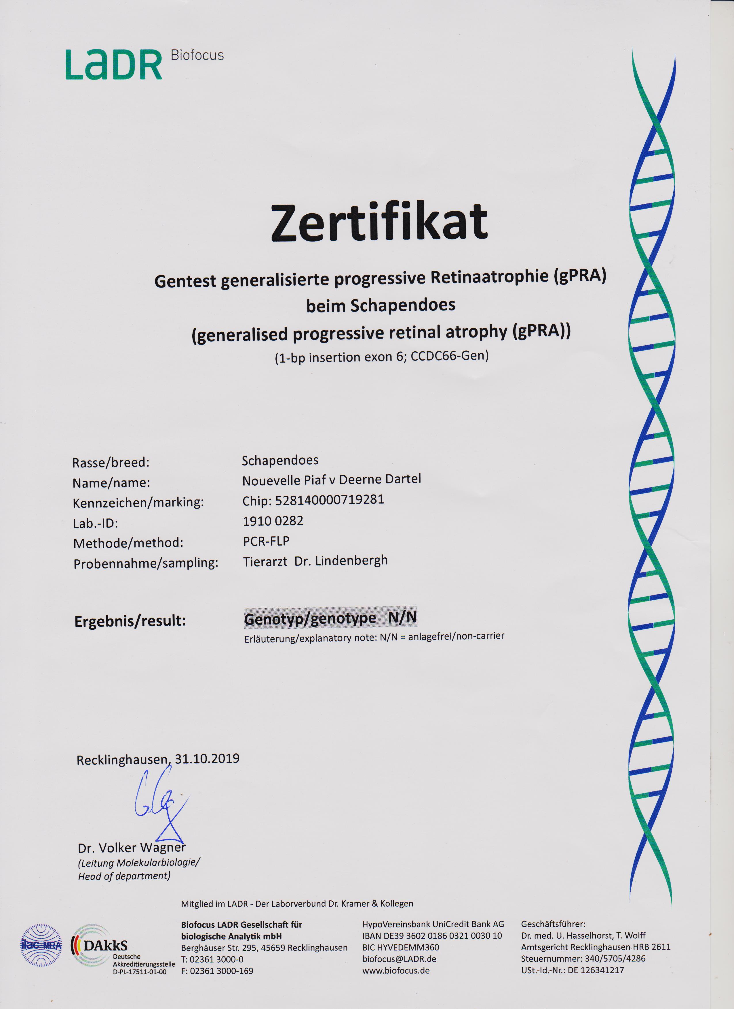 8-11-2019 De uitslag van mijn gen PRA is binnen gekomen en ik ben vrij (geen drager). Als ik pupjes krijg dan kunnen zij deze erfelijke vorm van PRA (oogziekte) niet krijgen.